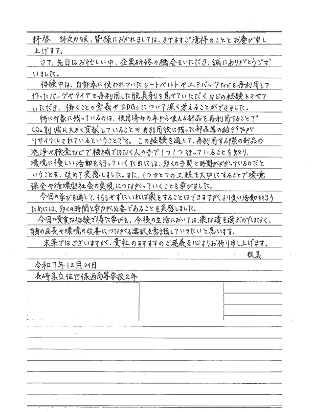 NGP日本自動車リサイクル事業協同組合は、2025年12月15日(月)、高校生の校外学習におけるSDGsをテーマとした企業訪問学習として、長崎県立佐世保西高等学校(長崎県佐世保市)の2年生8名の受け入れを実施しました。SDGsの活動に取り組む様々な企業の中から、NGPに関心を持ってくださった8名の学生の皆様にお越しいただきました。